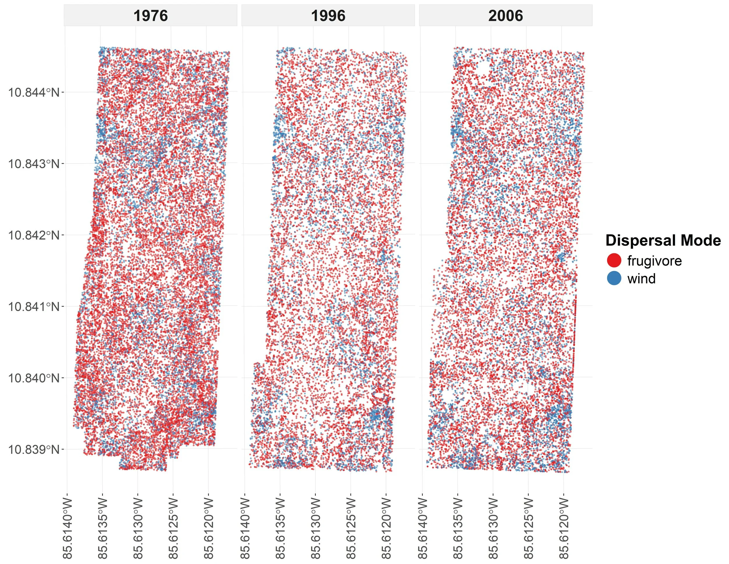 Analysis of the San Emilio plot censuses (1976, 1996, and 2006) revealed an unexpected stability in the abundance of frugivore- and wind-dispersed species over time, suggesting complex influence of climate change effects on dispersal syndromes dynamics.